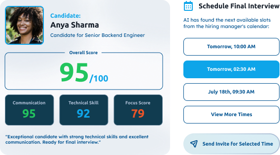 Shortlisted candidates get a direct link to schedule a final, human-to-human interview based on your calendar’s availability.