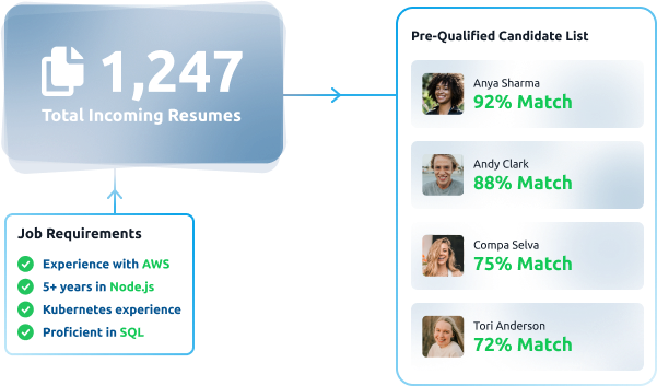 Stop wasting hundreds of hours on unqualified candidates. Our AI automates your hiring funnel from resume screening to initial interviews, so you only meet the best.